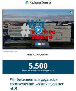 Leider stößt die Aachener Zeitung, deren Abonnent (AN) ich seit knapp 50 Jahren bin, mit ihrer Berichterstattung und Kommentierung zu den Demos, der AfD und insbesondere mit der Bekenneraktion #WirgegenrechteHetze und das angebliche „Gedankengut der rechtsextremen AfD“ in´ s gleiche präfaschistische Horn: