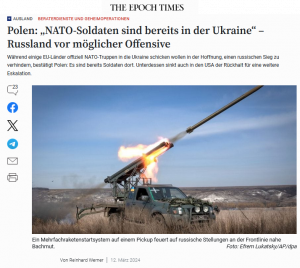 Am Freitag, 8. März, hatte sich Polens Außenminister Radoslaw Sikorski hinter Frankreichs Präsidenten Emmanuel Macron gestellt. Dieser hatte offen über die Entsendung von Bodentruppen der NATO in die Ukraine spekuliert, obwohl es für diese weder im NATO-Statut noch durch einen Beschluss des UN-Weltsicherheitsrats eine Grundlage gibt.
