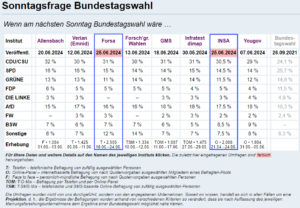 - Tichys Einblick am Morgen 26.6.2024: Weniger gab das Demoskometer den Grünen seit 2018 nie: 11 Prozent. 23 Prozent der Befragten trauen derzeit am ehesten den Unionsparteien, 7 Prozent der SPD , je 6 Prozent Grünen und AfD, 2 Prozent der FDP zu, mit den Problemen des Landes fertig zu werden – 51 Prozent trauen das keiner Partei zu (Umfrage Forsa für RTL/ntv, 18. bis 24. Juni 2024).