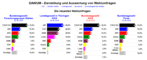 Vergrößern & Quelle/aktuelle Umfragen plus Forschungsgruppe Wahlen Bundestag Spezial, INSA Thüringen Spezial, INSA Bundestag Spezial, Forsa Bundestag Spezial