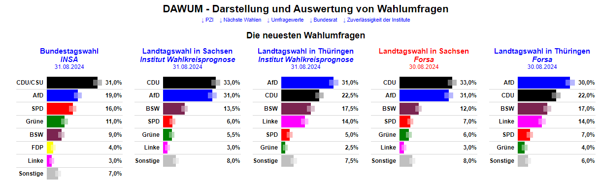 Vergrößern & Quelle/aktuelle Umfragen, INSA Bundestag Spezial, Institut Wahlkreisprognose Sachsen Spezial, Institut Wahlkreisprognose Thüringen Spezial, FORSA Sachsen Spezial, FORSA Thüringen Spezial,