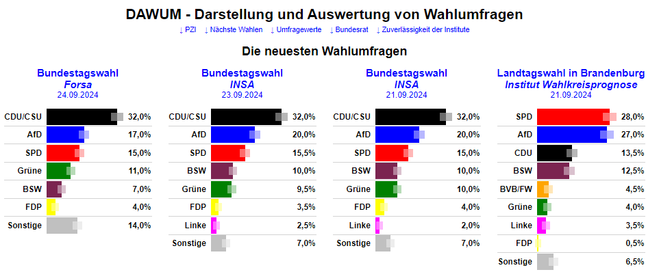 Vergrößern & Quelle/aktuelle Umfragen,FORSA Bundestag Spezial, INSA Bundestag Spezial II, INSA Bundestag Spezial IINSTITUT WAHLKREISPROGNOSE Brandenburg 21.9.2024