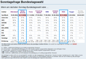 Vergrößern & Quelle/aktuelle Umfragen, FORSA Bundestag Spezial, INSA Bundestagswahl Spezial II, INSA Bundestagswahl Spezial I, FG Wahlen Bundestag Spezial