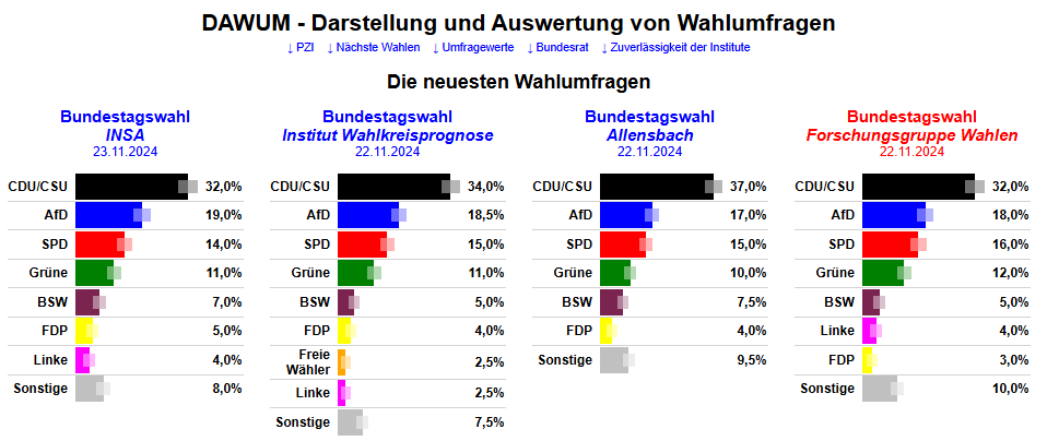 Vergrößern & Quelle/aktuelle Umfragen: INFRATEST dimap Hamburg Spezial, FORSA Bundestag Spezial, INSA Bundestag Spezial II, INSA Bundestag Spezial I, Institut Wahlkreisprognose Bundestag Spezial, Allensbach Bundestag Spezial, FG Wahlen Bundestag Spezial