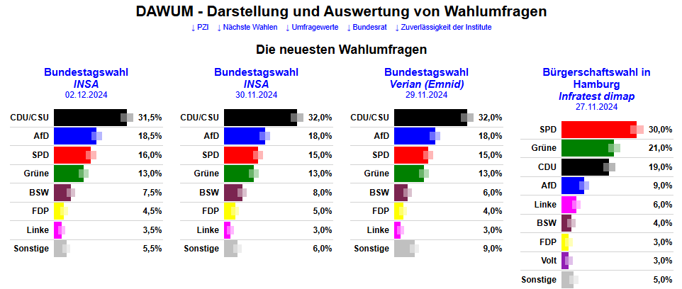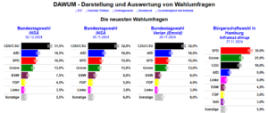 Vergrößern & Quelle/aktuelle Umfragen: INSA Bundestag Spezial II, INSA Bundestag Spezial I, VERIAN (Emnid) Bundestag Spezial, INFRATEST dimap Hamburg Spezial