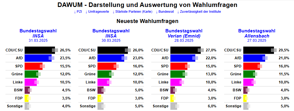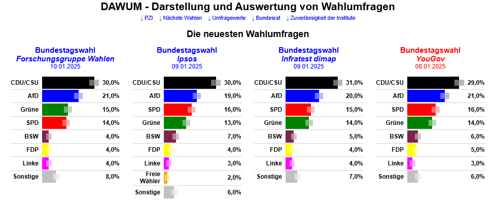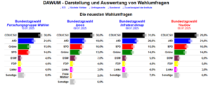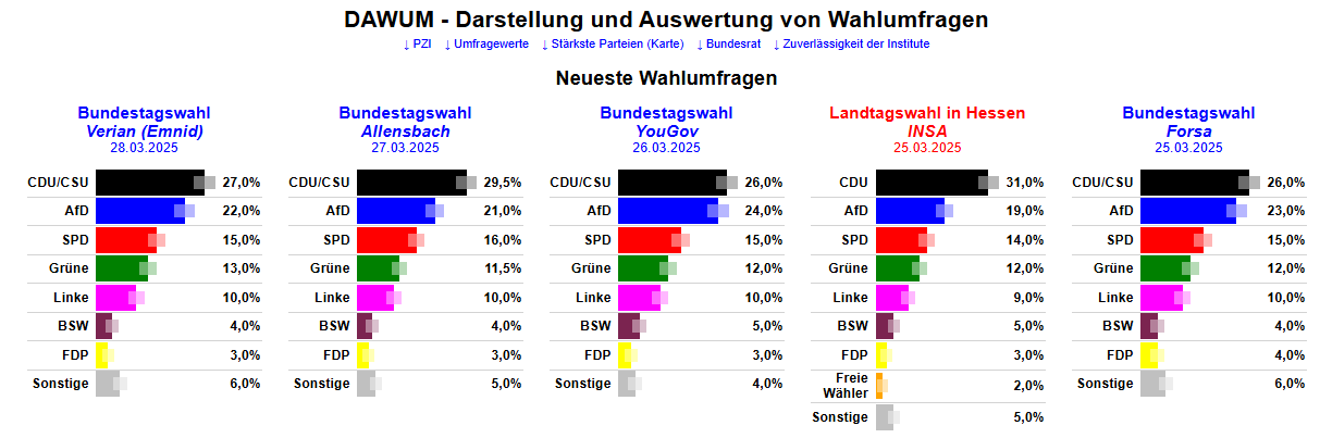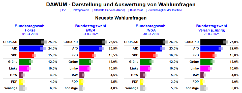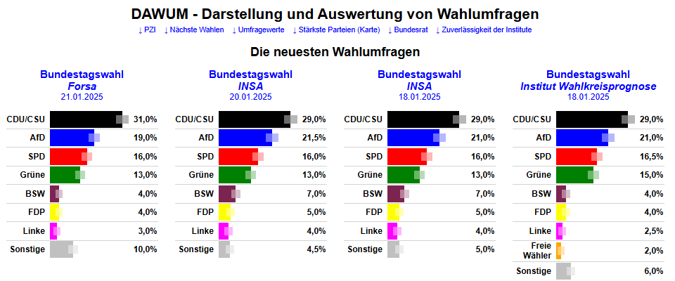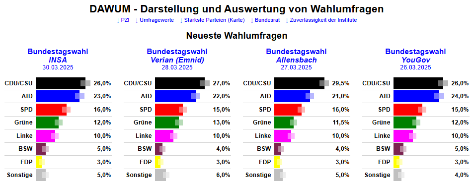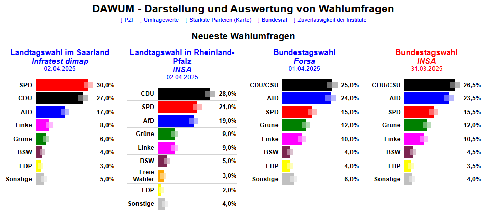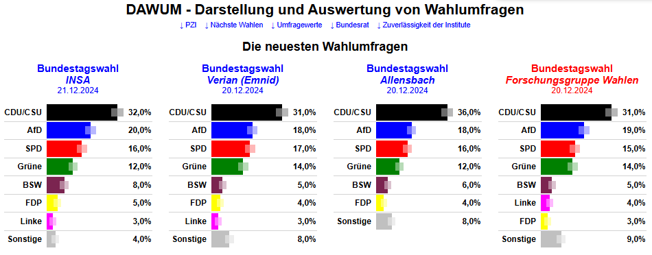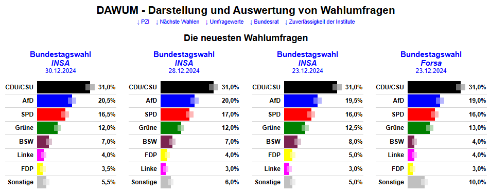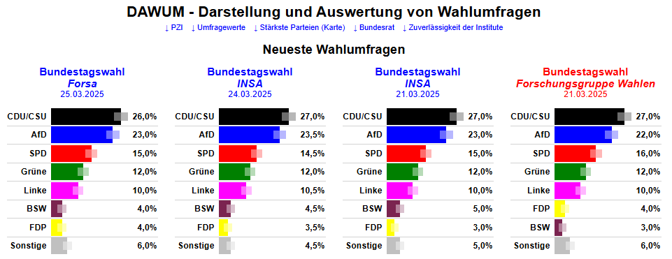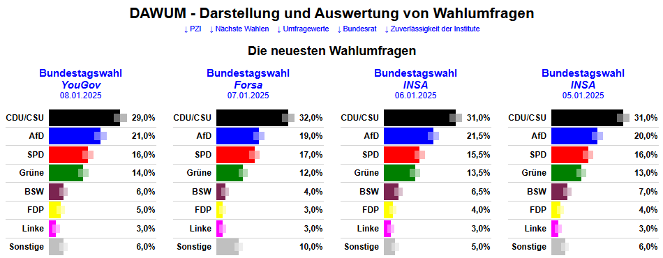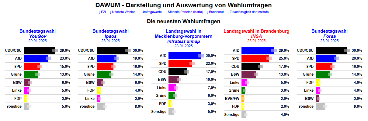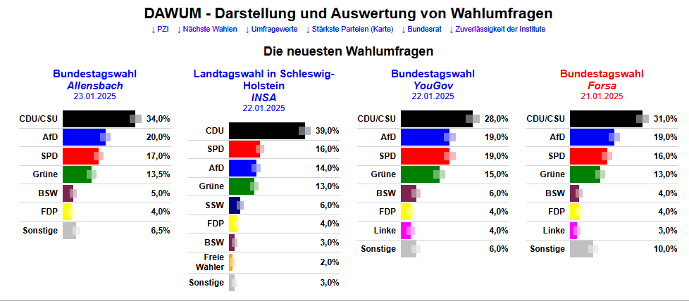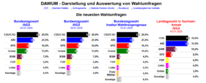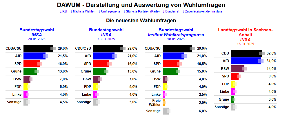 Vergrößern & Quelle/aktuelle Umfragen: INSA Bundestag Spezial, INSTITUT Wahlkreisprognose Bundestag Spezial, INSA Sachsen-Anhalt Spezial, YouGov Bundestag Spezial, INFRATEST dimap Hamburg Spezial