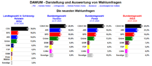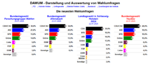 Vergrößern & Quelle/aktuelle Umfragen: INSA Schleswig-Holstein Spezial, YouGove Bundestag Spezial, FORSA Bundestag Spezial, INSA Bundestag Spezial