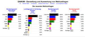 Vergrößern & Quelle/aktuelle Umfragen: Allensbach Bundestag Spezial, INSA Schleswig-Holstein Spezial, YouGove Bundestag Spezial, FORSA Bundestag Spezial
