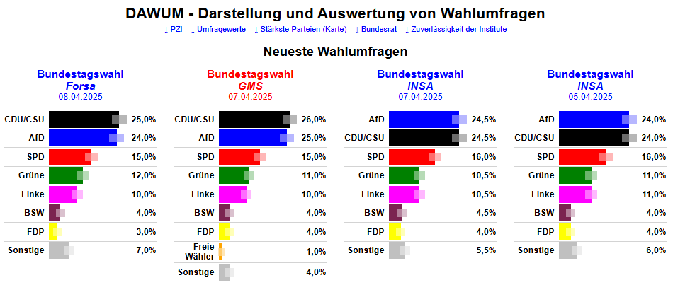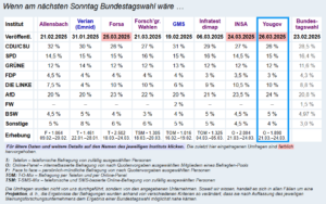 Quelle/aktuelle Umfrage: Institut Wahlkreisprognose Bundestag Spezial, Infratest dimap Bundestag Spezial, Pollytix Bundestag Spezial, YouGov Bundestag Spezial, Forsa Bundestag Spezial, INSA Bundestag Spezial