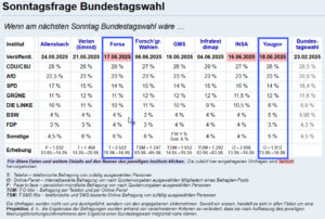 Vergrößerung – Quelle/Umfragen aktuell:Verian (Emnid) Bundestag Spezial & FG Wahlen Bundestag Spezial & Infratest dimap Bundestag Spezial & Forsa Bundestag Spezial