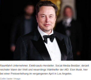 Eigentlich ist es unglaublich witzig: Weil jedermann und seine Oma, der auch nur einen Hauch von Kritik an den Regierenden und ihrem Handeln äußerte, sofort ein Nazi, Faschist und der personifizierte Teufel war, meinen jetzt die derart Etikettierten, Gleichgesinnte seien unter den als Faschisten und Nazis Bezeichneten zu finden. Das kann man derzeit bei Elon Musk und der AfD sehen, deren Vorsitzende Weidel er zu einem Talk eingeladen hat. Sie soll dem Vernehmen nach auch Ehrengast bei Trumps Amtseinführung sein. […]