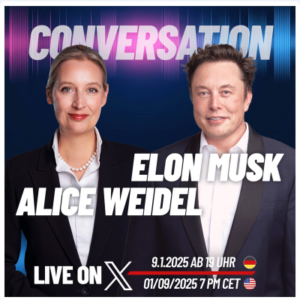 Am 9.1.2025 findet um 19:00 Uhr MEZ in NYC das Gespräch Elon Musk mit Alice Weidel statt.