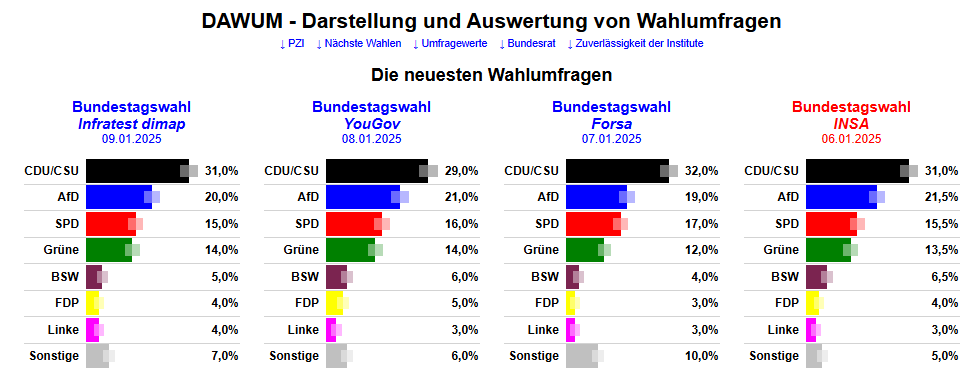 Vergrößern & Quelle/aktuelle Umfragen: INFRATEST dimap Bundestag Spezial, YouGove Bundestag Spezial, FORSA Bundestag Spezial, INSA Bundestag Spezial