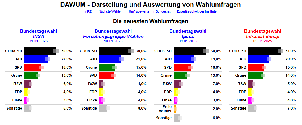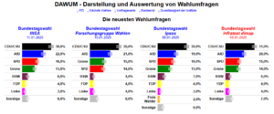 Vergrößern & Quelle/aktuelle Umfragen: INSA Bundestag Spezial, FG Wahlen Bundestag Spezial, IPSOS Bundestag Spezial, INFRATEST dimap Bundestag Spezial
