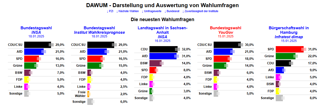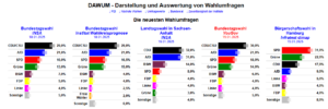 Vergrößern & Quelle/aktuelle Umfragen: INSA Bundestag Spezial, INSTITUT Wahlkreisprognose Bundestag Spezial, INSA Sachsen-Anhalt Spezial, YouGov Bundestag Spezial, INFRATEST dimap Hamburg Spezial