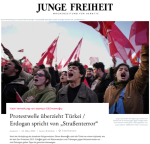 ANKARA. Wenige Tage nach der Verhaftung des Istanbuler Bürgermeisters Ekrem İmamoğlu (CHP) hat eine Protestwelle die Türkei erfaßt. Wie die Tageszeitung Cumhuriyet am Samstag berichtete, hätten sich die vor allem abends stattfindenden Demos gegen Präsident Recep Tayyip Erdoğan (AKP) inzwischen auf alle größeren Städte des Landes ausgeweitet, darunter Izmir, Ankara, Bursa und Istanbul selbst. […]