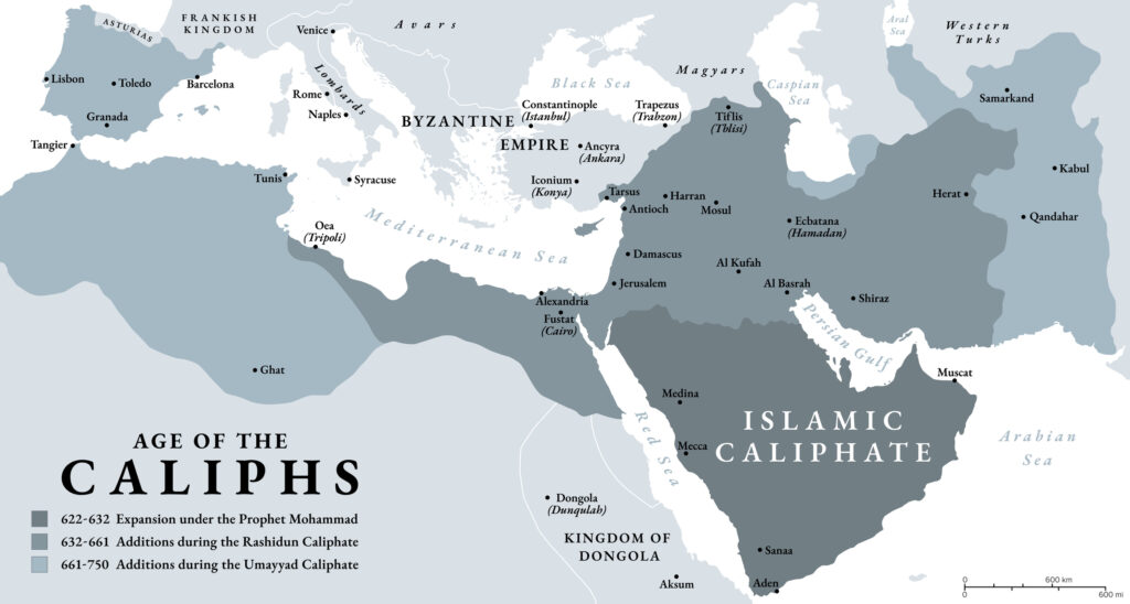 The age of the Caliphs, history map of the Islamic Caliphate 622 to 750