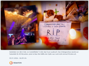 Nach der Identifizierung aller 40 Todesopfer des Brandinfernos in Crans-Montana steht fest: Viele derjenigen, die es nicht mehr lebend aus der brennenden Bar schafften, sind noch nicht volljährig gewesen. Das jüngste Todesopfer ist eine 14-jährige Schweizerin, wie die Schweizer Polizei im Kanton Wallis berichtet. Darunter waren unter anderem Italiener und Franzosen, Deutsche waren nicht unter den Todesopfern.