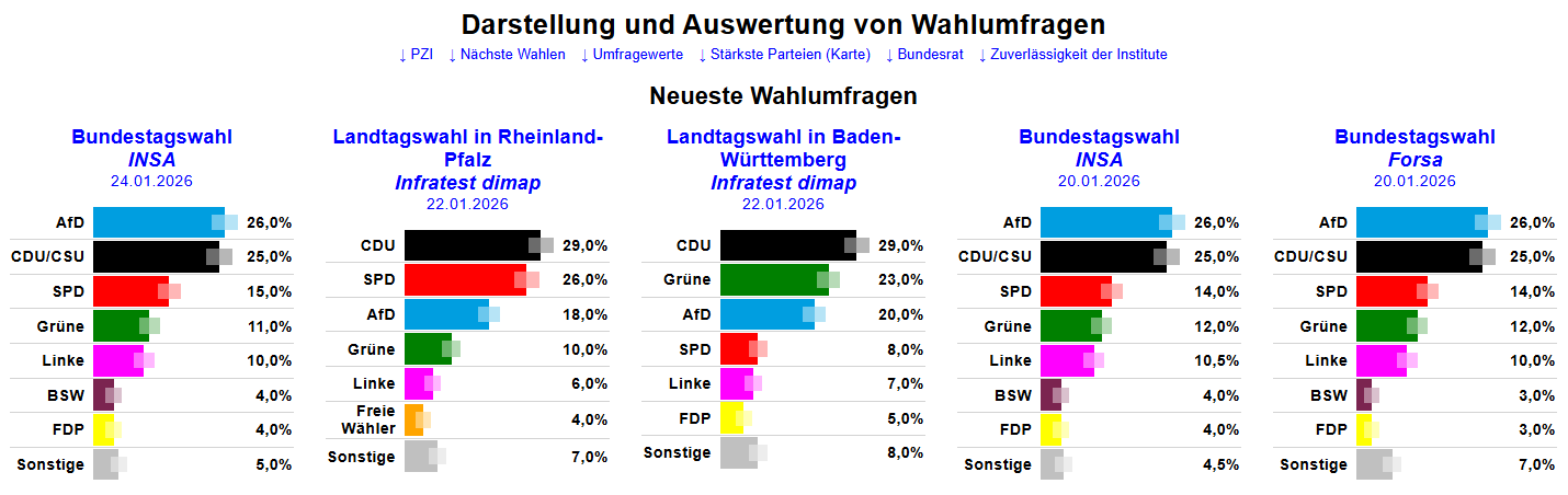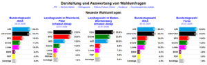 Umfragen Landtagswahlen: AfD fällt 1% zurück. Grüne legen in BW 3% zu; SPD legt in RP 3% zu.