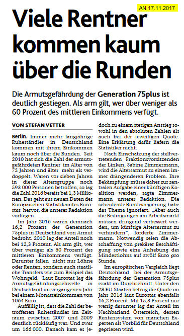 und Ausgrenzung bedroht. Die Rentenpolitik der vergangenen Jahre hat den Bedürftigen nichts gebracht. Auch die potenziellen Jamaika-Partner setzen mehr oder weniger auf falsche Rezepte.“