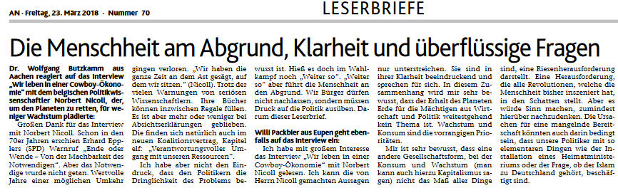 Deshalb ist mal richtig spannend, wie ein verhältnismäßig junger Weltenretter, der 36-jährige Politologe Norbert Nicoll aus Belgien, die Sache sieht. Dass er einen Nerv getroffen hat, belegen die Leserbriefe oben.