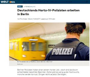 Er sagt: ´ Die Qualität der Bewerber für die Polizeiausbildung ist eine Katastrophe.`Um die offenen Stellen trotzdem zu besetzen, habe das Land Berlin die Einstellungsanforderungen drastisch gesenkt. Die Folgen könnte man jeden Tag in den Ausbildungsstätten der Polizei sehen.“ Quelle: Bericht oben rechts