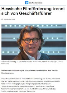 Da trifft Hans-Joachim Mendig, der ´zum Glück` bereits 66 Jahre alt ist, den Bundesvorsitzenden – Jörg Meuthen – einer demokratischen und sehr erfolgreichen Partei (AfD=größte Oppositionspartei im aktuellen Bundestag). Es kommt zu einem Shitstorm von so genannten „Filmschaffenden“. Hier die Liste der Erstunterzeichner*. Die politische Führung des Landes Hessens, allen voran ´Kunstministerin` Angela Dorn (Grüne), sah sich wegen des Treffens veranlasst, den Mann seines Postens zu entheben.