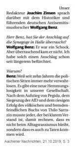Das Interview (Komplett: Hier klicken), das der links-grün-orientierte Politredakteur der AN Joachim Zinsen mit Wolfgang Benz führt, beginnt mit einer ungeheuren Behauptung: