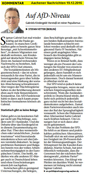 Herr Gabriel macht in der Tat das, was die AfD tut: Den Finger in die Wunde eines Umstands zu legen, der einfach nicht in Ordnung ist. Sei es wie hier der Kindergeldmissbrauch, oder die fehlende Legitimation einer tiefgreifenden Flüchtlingspolitik durch den Bundestag , das diktatorische Einläuten der unsäglich teuren Energiewende und vieles mehr.