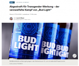 „Boykottiert Bud Light und trinkt es niemals wieder“, schrieb daraufhin etwa der Fernsehmoderator und Republikaner Mike Crispi im Kurznachrichtendienst Twitter. Viele Kunden folgten dem Aufruf: Die Bierverkäufe gingen in der Woche bis zum 10. Juni um satte 26,8 Prozent zurück, wie Daten von US-Beraterfirma Bump Williams Consulting und dem Datenunternehmen NielsenIQ zeigen.