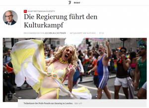 … Nationen, die schon vor uns Deutschen mit der sogenannten Selbstbestimmung von trans- und intergeschlechtlichen Menschen experimentiert haben, lernten zweierlei: Die gesetzliche Aufweichung der Kategorien Mann und Frau wühlt Gesellschaften emotional auf und hat weitreichende praktische Folgen.