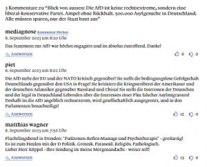 Bereits mit der Gründung der AfD kam es zum Vorwurf, die AfD sei nationalistisch und rechtsextrem. Mit jedem Wechsel zu einem neuen Vorsitzenden wurde die Vorzeit der Partei als gemäßigt charakterisiert, die anbrechende Zeit mit dem neuen Vorsitz sei ein weiterer Rechtsruck. Es würde immer schlimmer. Gleichzeitig kündigten die Altparteien an, die AfD inhaltlich stellen zu wollen. Was nicht mal ansatzweise umgesetzt wurde. Der Grund ist einfach. haben doch – nach meiner Schätzung – etwa 80% aller Wahlberechtigten ähnliche Ideen wie sie die AfD in ihren Programmen beschreibt. Was nicht weiter wundert. Stimmen diese Punkte doch im weitesten Sinn mit der Programmatik überein, die jeweils leicht modifiziert SPD, FDP und CDU/CSU noch Anfang der 2000-er Jahre vertrat, und die damals in Summe von um die 80% der Wähler gewählt wurden.