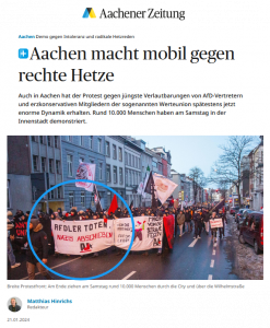 Meine Aussage ganz oben „Wer Menschen aus aller Welt millionenfach, illegal und unkontrolliert nach Deutschland einreisen lässt, …“ ist eine näherliegende Vermutung als das, was die AZ als „Hintergrund“ bezeichnet. Warum machen die AZ-Redakteure so etwas? Der angebliche „Rechtsextremismus der AfD“ soll möglichst nahe an die dunkelsten Zeiten Deutschland herangerückt werden. In der NS-Zeit wurden tatsächlich Menschen wegen ihrer Rasse und anderen nicht dem arischen Menschenbild genehmen Attributen vertrieben, deportiert und schlussendlich umgebracht. Dieses „in die Nähe rücken“ ist eine hasserfüllte und volksverhetzende Art eines rot-grünen Haltungsjournalismus, der in der Aachener Zeitung offensichtlich vorherrscht. Hinzu kommt, dass der Nationalsozialismus mit diesen „Heranrücken der AfD“ massiv verharmlost wird. Das müsste mittlerweile auch bei der AZ angekommen sein.