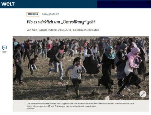 Der Gedanke der Palästinser besteht darin, die Weltöffentlichkeit mittels „friedlicher Demonstrationen“, die die Israelis so herauszufordern, dass diese mit militärischen Mitteln ihre Grenze sichern, so zu manipulieren, dass sie sich gegen Israel positioniert.