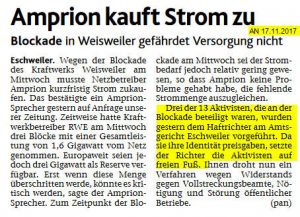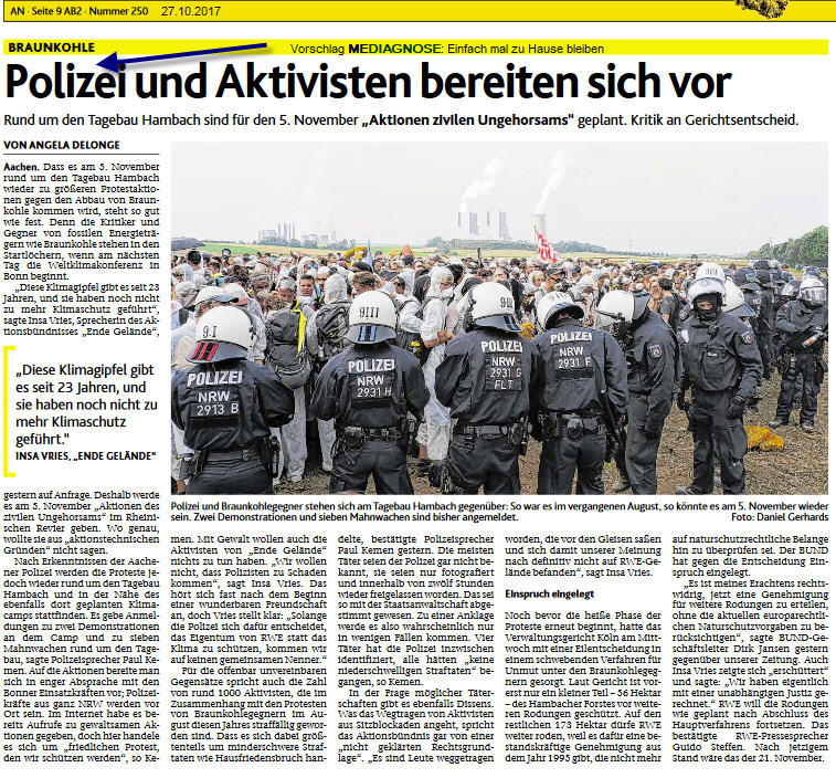 „Während der Urteilsverkündung fielen einzelne Aktivisten dem Richter ins Wort und riefen, dass im Hambacher Forst ´ein krasser Kampf` bevorstehe, Aktivisten gegen Waldarbeiter und Polizei.