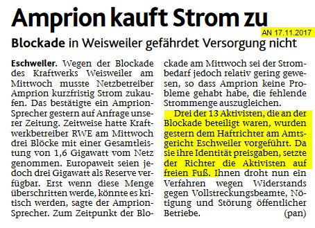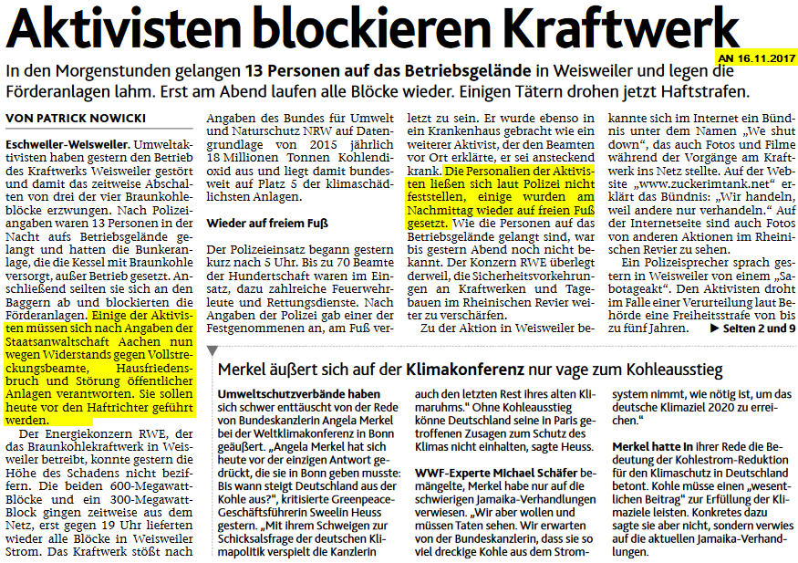 13 sogenannte Aktivisten besetzten das Kohlekraftwerk Weisweiler (1.600 Megawatt = 1,6 Gigawatt) und legten den Betrieb lahm.