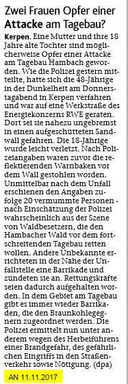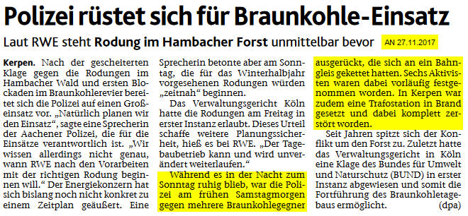 „Während es in der Nacht zum Sonntag ruhig blieb, war die Polizei am frühen Samstagmorgen gegen mehrere Braunkohlegegner ausgerückt, die sich an ein Bahngleis gekettet hatten. Sechs Aktivisten waren dabei vorläufig festgenommenworden. In Kerpen war zudem eine Trafostation in Brand gesetzt und dabei komplett zerstört worden.“ Quelle: Siehe Bericht rechts