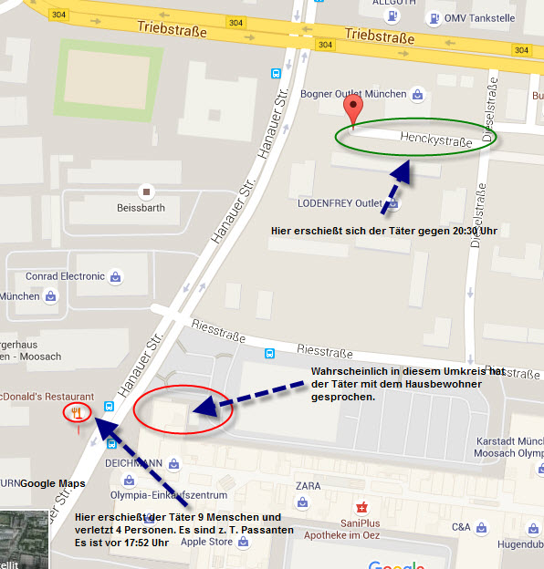 Ein junger Mann (18 Jahre), mit einer illegal beschafften Waffe (Glock 17), ein junger Mann, der wohl gemobbt, gehänselt wurde, nahm gnadenlos Rache. In einem Mäckes am OEZ. Er bestellte seine (vermeintlichen = evtl. nur stellvertretende) PeinigerInnen dorthin und erschoss sie. Es waren 3 Kosovaren, 3 Türken, 1 Grieche und ein Ungar. Alle noch sehr jung. Der Tod einer 45-jährigen Frau war vielleicht ein „Kollateralschaden“. 4 Personen werden durch den Täter verletzt. Etliche weitere Menschen erlitten Verletzungen auf der Flucht. Dann kann sich dieser Mann unbehelligt vom Tatort wegbewegen. Zeitweise führt er auf einem Parkhausdeck Gespräche mit einem Anwohner. Später schießt er sich selber in den Kopf. In der Henckystr.
