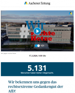 „Die „Aachener Zeitung“ ist für einen pluralistischen Diskurs über die Zukunft des Landes, Europa und der Welt. Nur so entsteht echte Demokratie. Wir wenden uns dabei gegen diejenigen, die mit ihrem rechtsextremen Gedankengut eben diese Pluralität gefährden. […]“