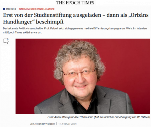 Auf der Website von Prof. Werner J. Patzelt erschien am 12. Februar 2024 ein längerer Artikel mit der Schlagzeile „Der Konservatismus, die Studienstiftung und Viktor Orbán“. Dahinter verbirgt sich eine Art Sittengemälde der Gegenwart, die Chronologie eines medialen Versuchs, einen der bekanntesten Politikwissenschaftler in Deutschland zu diskreditieren.