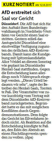 „Wen es an diesem Sonntagnachmittag in die Düsseldorfer Altstadt verschlägt, der muss vor einigen Kneipen und Gasthäusern mit verschlossenen Türen rechnen. Grund dafür ist eine Wahlkampfveranstaltung der AfD und Sicherheitsbedenken der Gastronomen.“