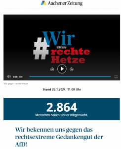 Leider stößt die Aachener Zeitung, deren Abonnent (AN) ich seit knapp 50 Jahren bin, mit ihrer Berichterstattung und Kommentierung zu den Demos, der AfD und insbesondere mit der Bekenneraktion #WirgegenrechteHetze und das angebliche „Gedankengut der rechtsextremenAfD“ in´ s gleiche präfaschistischeHorn: