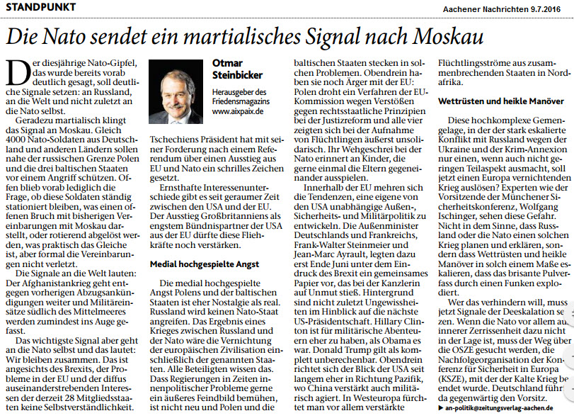 Da ist es bemerkenswert, dass die auf Seite 3 der Ausgabe vom 6.7.2016 einen ausführlichen und neutralen Bericht über die Situation an der Ostgrenze der NATO bringt.