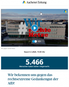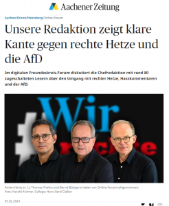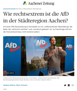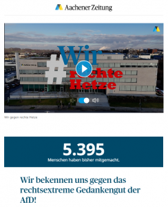 Dann erfolgt eine angekündigte, sogenannte Differenzierung. Die macht den Sachverhalt durchaus nicht besser: „… und zwar nicht, weil sie zwangsläufig Nazi-Überzeugungen haben, oder , weil sie ins Dritte Reich zurück wollen – das will die AfD zunächst auch nicht. Die will was Anderes, was nicht weniger gefährlich ist.“ Bleibt die Frage, was sind „Nazi-Überzeugungen“ und was will die AfD anderes, was nicht weniger gefährlich ist, als „zurück in´ s Dritte Reich“
