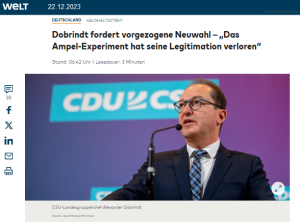 … Nächstes Jahr wird ein entscheidendes Jahr für die AfD. Und Alice Weidel verspricht: „Wir werden diese Republik vom Kopf auf die Füße stellen!“ Die Enteignungs-Politik der Ampelregierung werde dazu führen, dass das Pendel zurückschlägt und die Bürger eine patriotische Alternative wählen. Deshalb werde der „Denunzianten- und Spitzelstaat alles versuchen“, um die AfD 2024 abzuschießen. Doch man sei auf die Angriffe vorbereitet.
