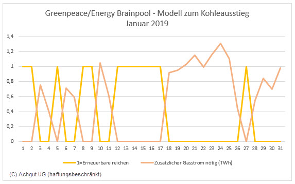Am 24.1.2019 wären 1,31 TWh Gasstrom nötig gewesen. Dafür wäre eine Gasstromkapazität von 55 GW nötig. Installiert sind z. Zt. etwa 30 GW. Es käme nach einer Verdoppelung der installierten Leistung Gas also gerade so hin. Rein rechnerisch.