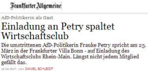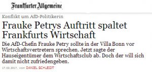 „[…] teilte die Frankfurter Gesellschaft für Handel, Industrie und Wissenschaft, die als Eigentümerin der Villa Bonn auch für die Vermietung des Hauses verantwortlich ist, dem Wirtschaftsclub Rhein-Main mit, dass die für den 23. März in dem Gebäude an der Siesmayerstraße im Westend geplante Veranstaltung des Wirtschaftsclubs dort nicht stattfinden kann. Der Vorsitzende des Klubs, Thomas Kremer, hatte die AfD-Bundesvorsitzende zu einem Referat eingeladen, sie sollte zum Thema ´ Deutschland im Wahljahr – Realität der demokratischen Debatte ` sprechen.“ Quelle, auch des Zitates unten: Artikel links