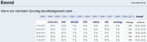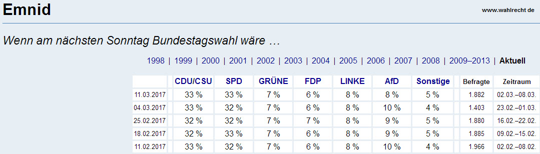 Es fällt auf, dass die Emnid-Umfrage tatsächlich das jüngste Veröffentlichungsdatum (11.3.2017) aufweist. Forsa hatte allerdings bereits am 10.3.2017 den gleichen Wert wie Emnid, 8 % für die AfD, ermittelt. Bei Forsa allerdings liegt die SPD noch 2 Zähler hinter der CDU.