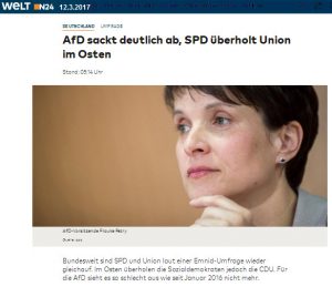 Aus Anlass des „Absackens“ der AfD in der Emnid Umfrage vom 11.3.2017 möchte ich auf die selektive Berichterstattung von Medien, – hier WELTonline – aufmerksam machen.