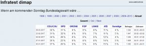 Oben rechts berichtetWELTonline vom „tiefsten Wert=8,5 %“ seit 2015 bei der AfD. Allensbach hat das Ergebnis vom 1 bis 15. 2.2017 erhoben und am 22.2.2017 veröffentlicht. INSA hingegen hat am 21.2.2017 das Ergebnis einer Umfrage vom 17.2. bis 20.2. 2017 veröffentlicht. Da liegt die AfD bei 11%. Und, man lese und staune, bei Forsa liegt die AfD sogar noch tiefer als beim „tiefsten“ Wert von Allensbach, nämlich bei 8%. Diese Umfrage wurde ebenfalls am 22.2.2017 veröffentlicht, die Daten wurden vom 13. bis 17.2.2017 erhoben.